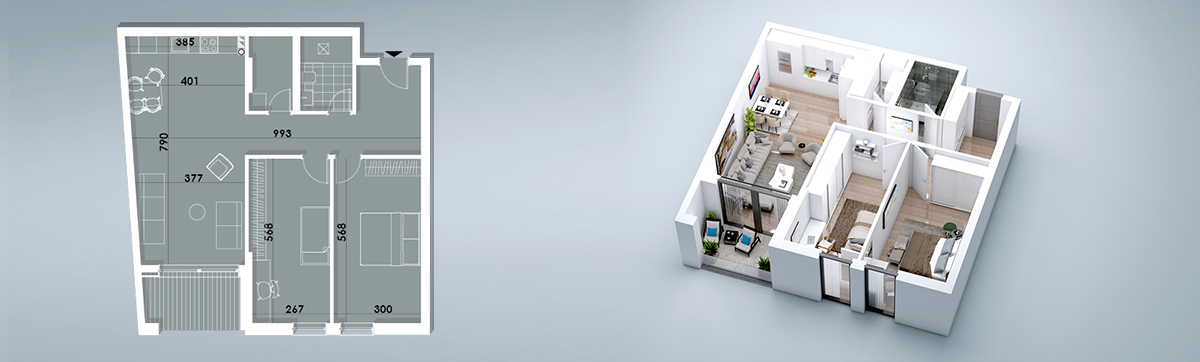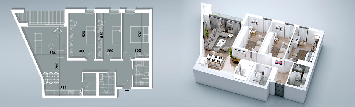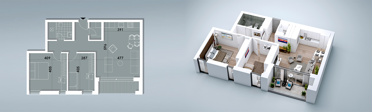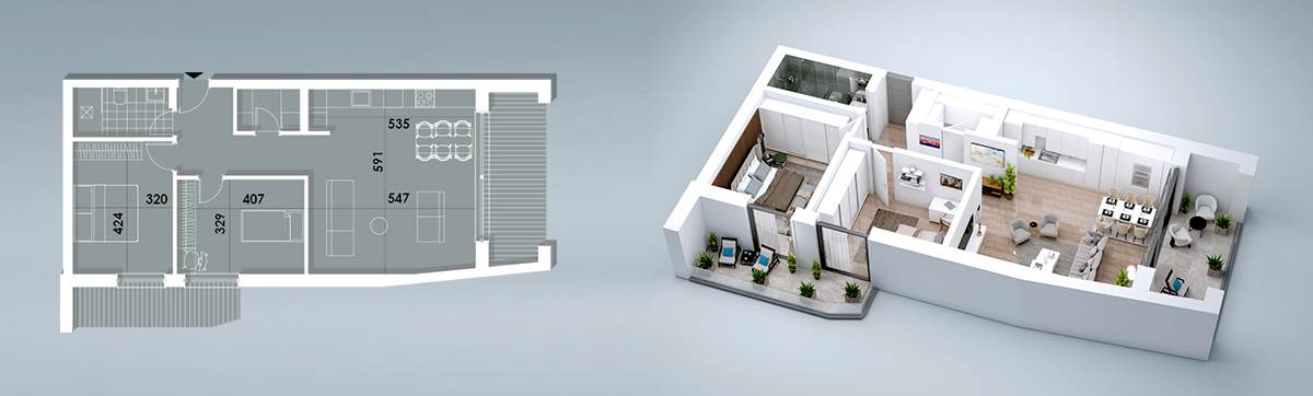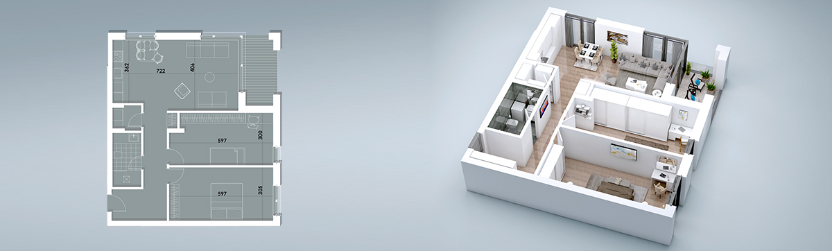 Qëndrimi Ditorë dhe Kuzhina: 24.65 m2 | Dhoma e Fjetjes: 15.61 m2 | Dhoma e Fjetjes: 14.39 m2 | Banjo: 5.38 m2 | Depo/wc: 3.12 m2 | Koridori: 8.50 m2 | Ballkoni: 7.17 m2