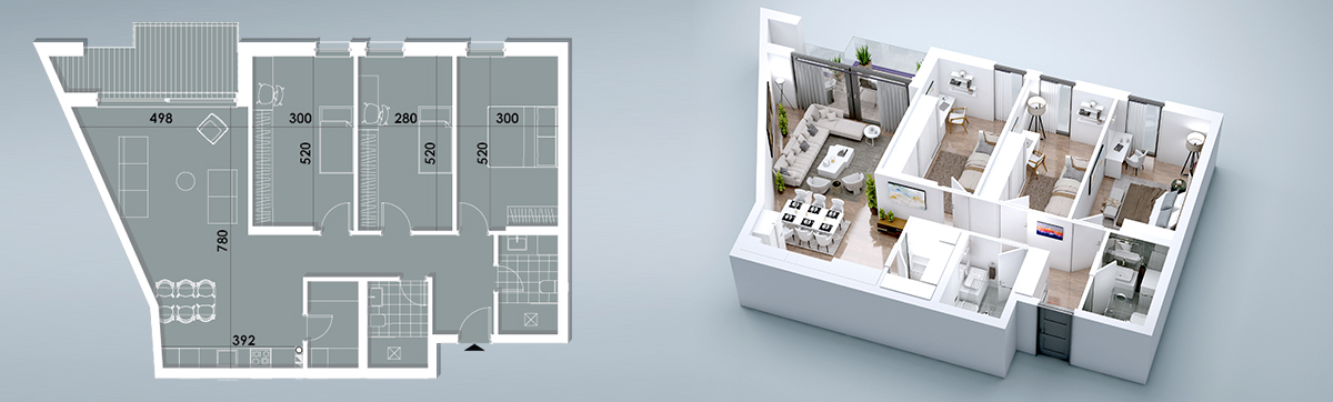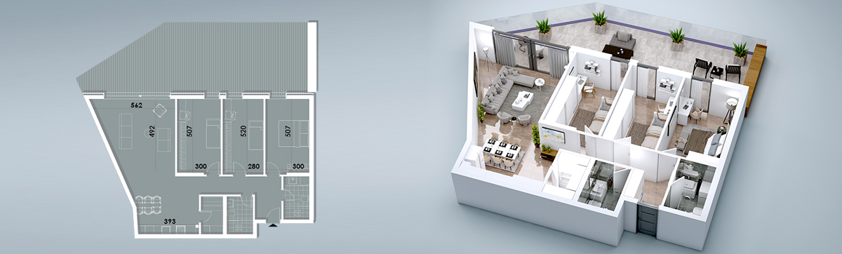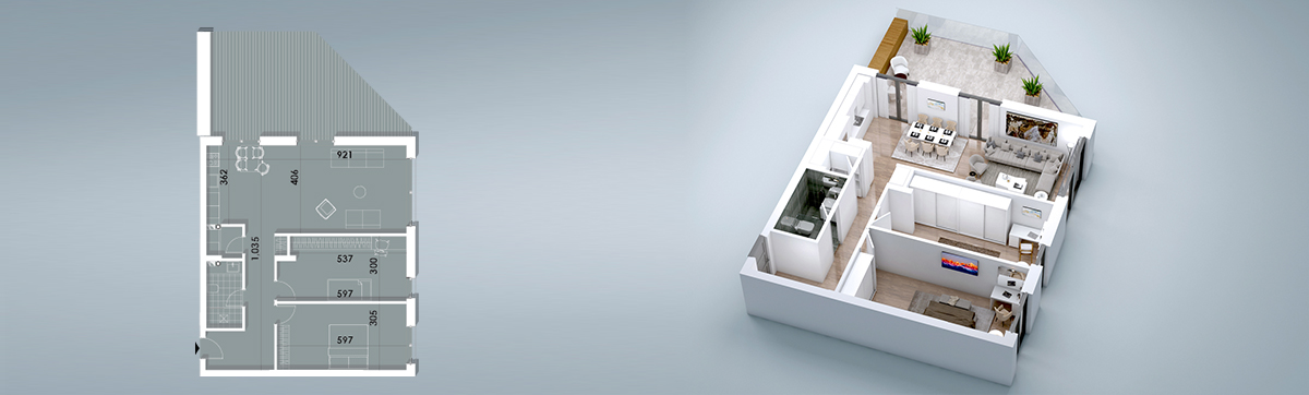 Qëndrimi Ditorë dhe Kuzhina: 30.09 m2 | Dhoma e Fjetjes: 15.61 m2 | Dhoma e Fjetjes: 14.39 m2 | Banjo: 5.36 m2 | Depo/wc: 3.12 m2 | Koridori: 8.50 m2 | Terasa: 49.58 m2
