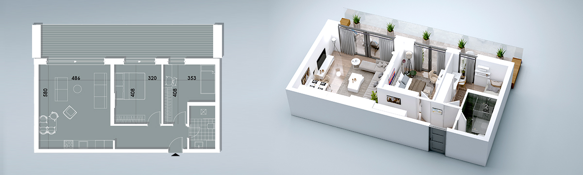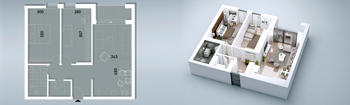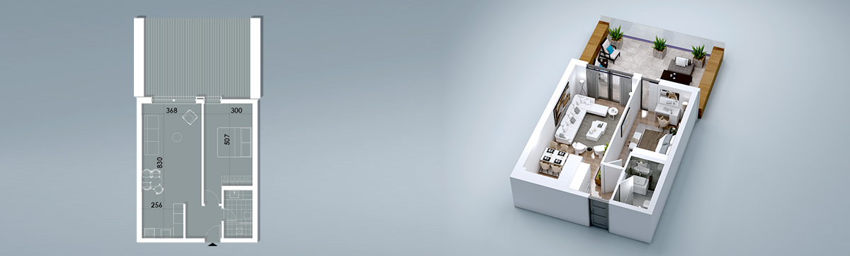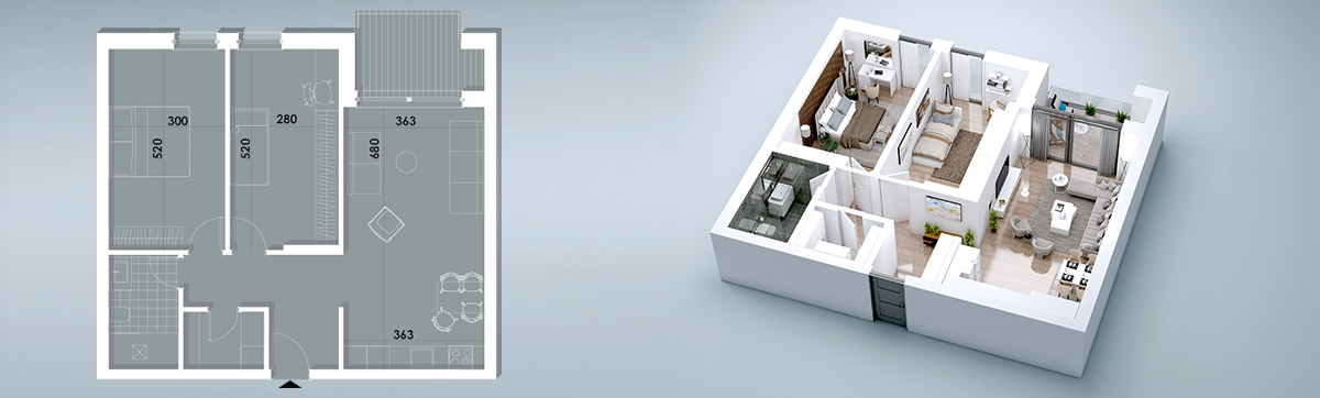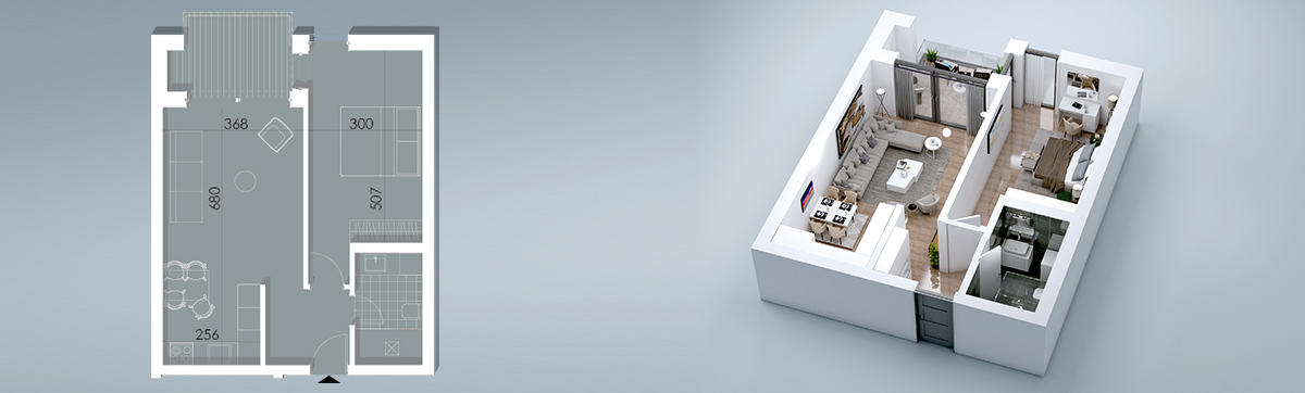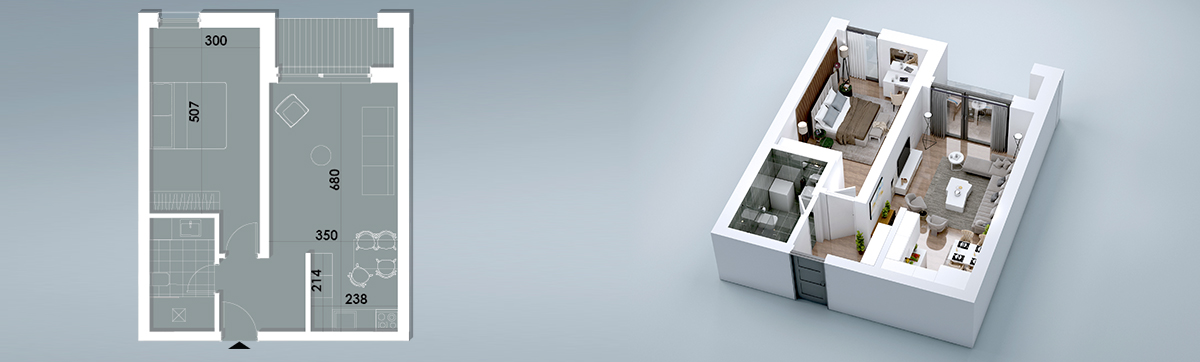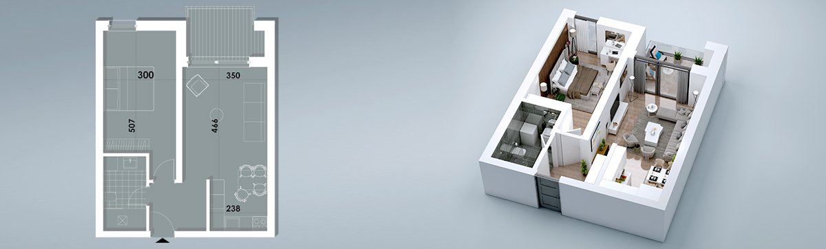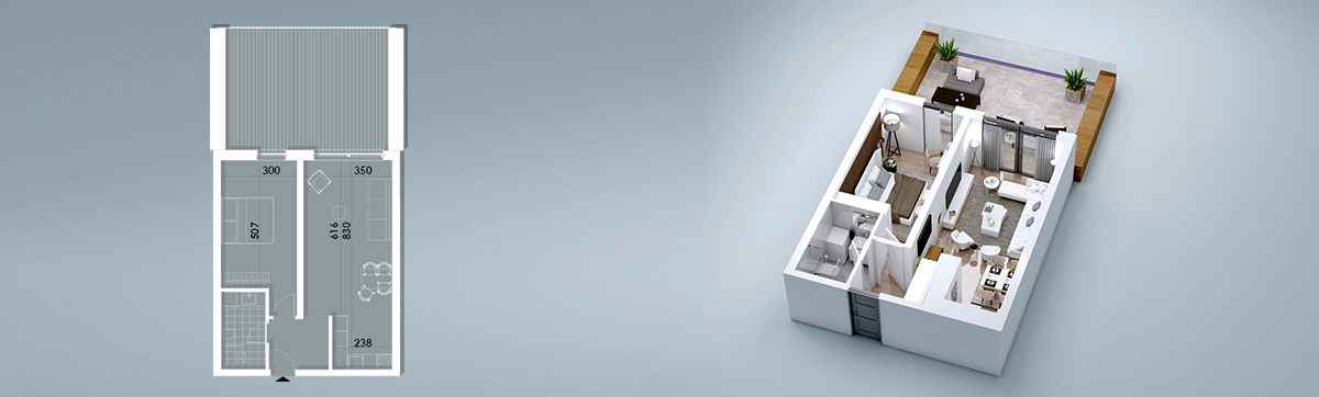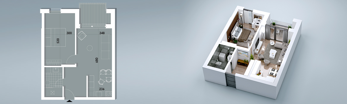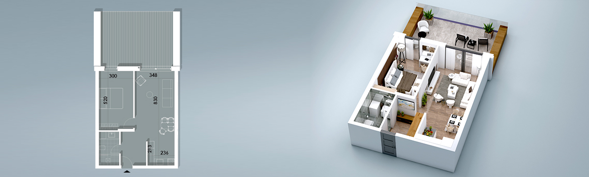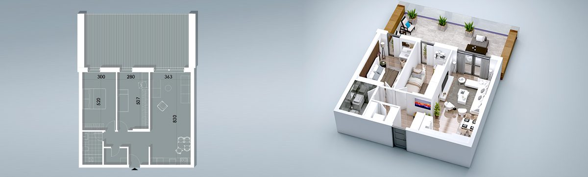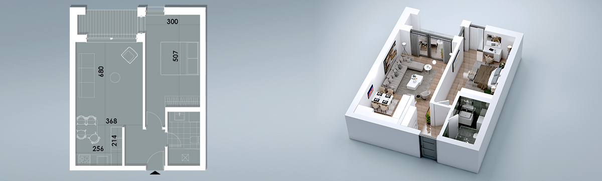 Qëndrimi Ditorë dhe Kuzhina: 20.37 m2 | Dhoma e Fjetjes: 15.44 m2 | Banjo: 5.30 m2 | Koridori: 6.60 m2 | Ballkoni: 6.96 m2