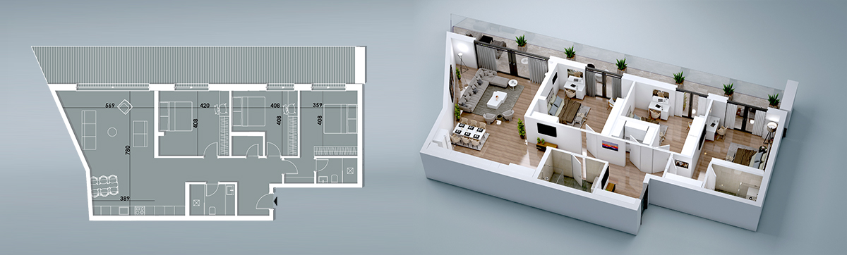 Qëndrimi Ditorë dhe Kuzhina: 42.57 m2 | Dhoma e Fjetjes: 23.93 m2 | Banjo: 4.20 m2 | Dhoma e Fjetjes: 14.18 m2 | Dhoma e Fjetjes: 14.18 m2 | Banjo: 7.09 m2 |Depo: 3.78 m2 |Koridori: 15.21 m2 | Terasa: 53.50 m2